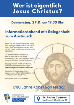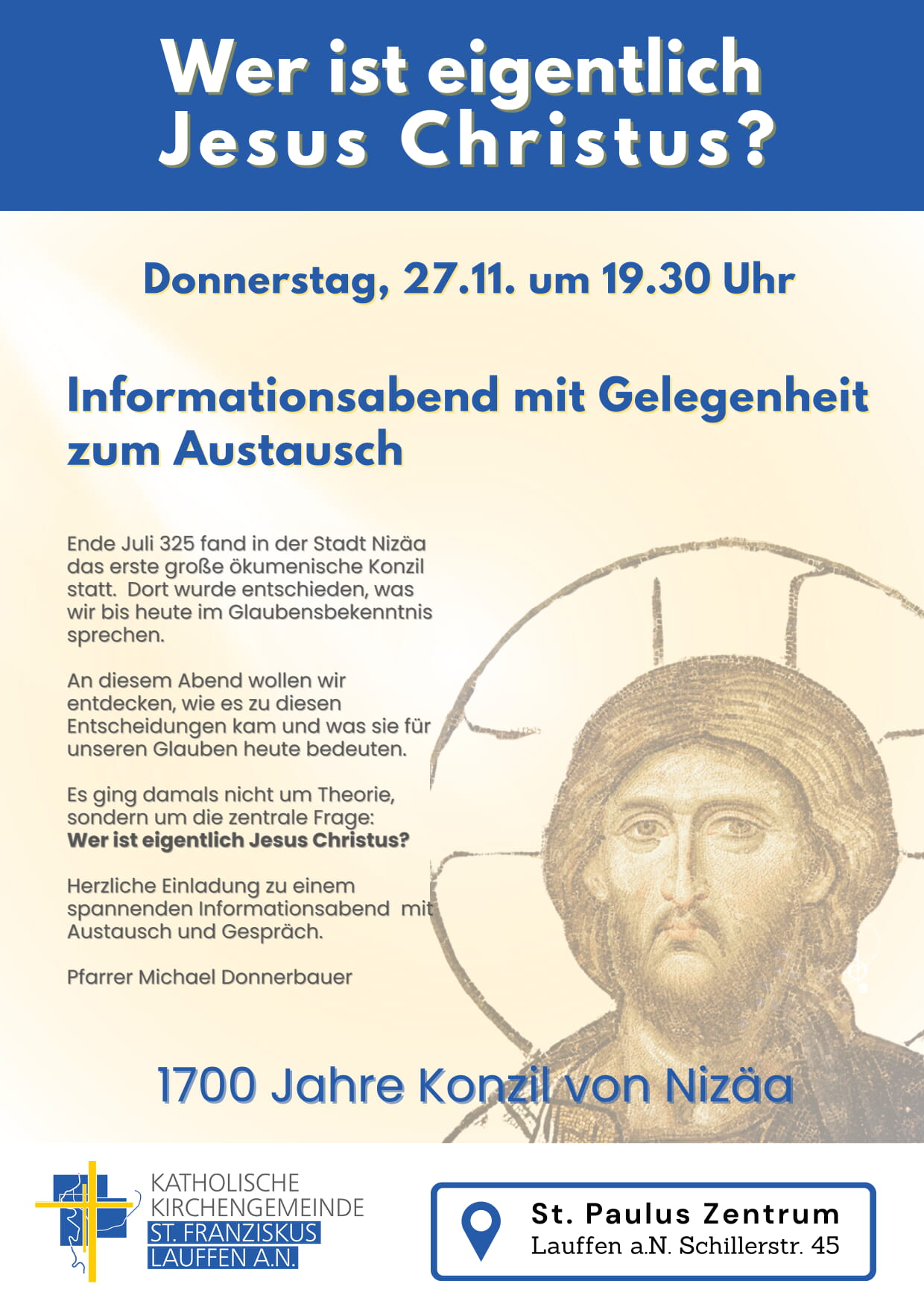 Ende Juli 325, also vor 1700 Jahren, endete das erste große ökumenische Konzil in der Stadt Nizäa, dem wir vor allem weite Teile unseres großen Glaubensbekenntnisses verdanken. Am 27. November wollen wir der Frage nachgehen, wie es zu den Entscheidungen des Konzils gekommen ist und welche Bedeutung diese bis heute für uns und unseren christlichen Glauben haben. Es ging bei dem Konzil damals nicht um eine theoretische Fragestellung, so eine Art theologische Fachsimpelei, sondern wesentlich um die Frage wer eigentlich Jesus Christus ist. Es ging um die Grundsatzfrage nach dem Heil und der Rettung unseres Lebens.