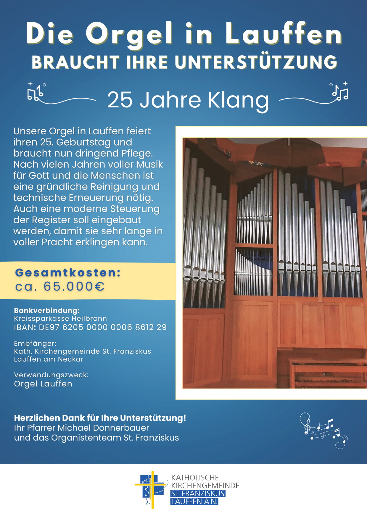 Unsere Orgel in Lauffen ist dieses Jahr 25 Jahre alt geworden. Sie wird zum Lobe Gottes und zur Freude von uns Menschen gespielt. Doch nach dieser Zeit ist eine professionelle Ausreinigung und technische Überholung zwingend erforderlich. Gleichzeitig muss auch das Leder des Blasebalgs erneuert werden, das inzwischen brüchig geworden und bisher nur notdürftig geflickt worden ist, damit keine Luft entweichen kann, was unschöne Geräusche hervorrufen würde.