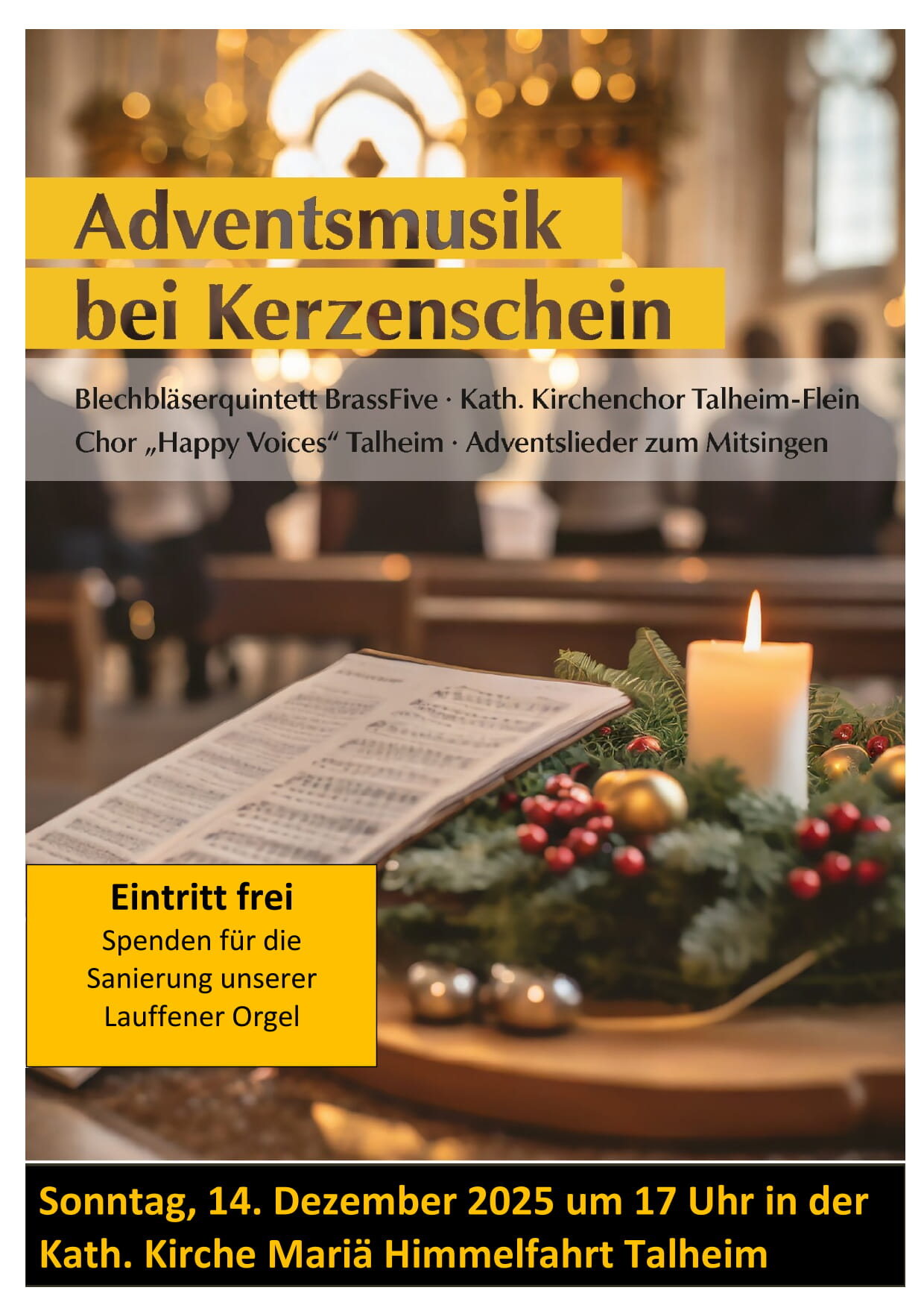 Am 3. Adventssonntag ist es wieder so weit. Dann findet in unserer Kirche in Talheim die traditionelle Adventsmusik bei Kerzenschein statt. Das Musikprogramm gestalten der Kath. Kirchenchor Talheim-Flein, der Chor "Happy Voices" Talheim und das Blechbläserquintett BrassFive. In der stimmungsvollen Atmosphäre der mit Kerzen beleuchteten Kirche werden sie die Zuhörerinnen und Zuhörer mit festlichen Klängen auf die Festtage einstimmen. Das Programm wird ergänzt durch Orgelmusik und besinnliche Texte zum Advent. Für alle gibt es Adventslieder zum Mitsingen. Beginn ist um 17 Uhr, der Eintritt ist frei.