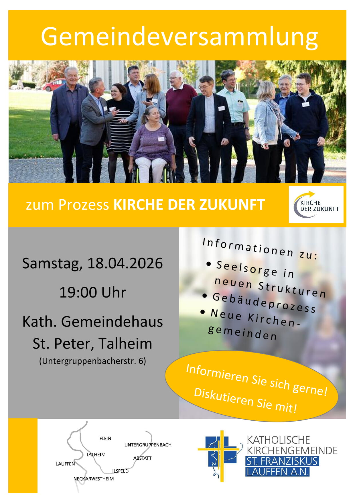 herzlich laden wir Sie zur Gemeindeversammlung am Samstag, 18.04. um 19:00 Uhr ins Gemeindehaus in Talheim (Untergruppenbacher Str. 6) ein.