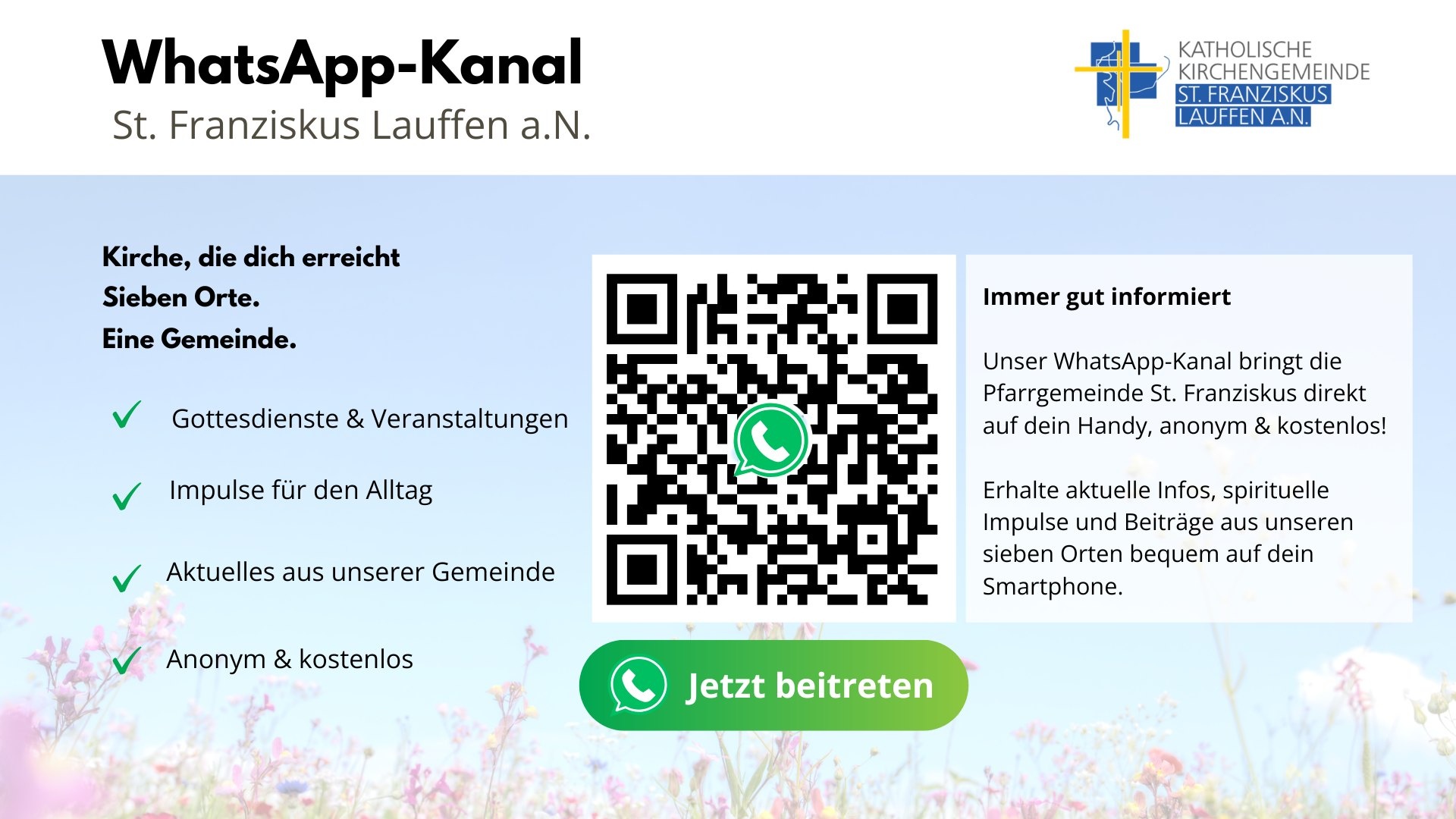 Unser WhatsApp-Kanal bringt die Pfarrgemeinde St. Franziskus direkt auf dein Handy – anonym und kostenlos!