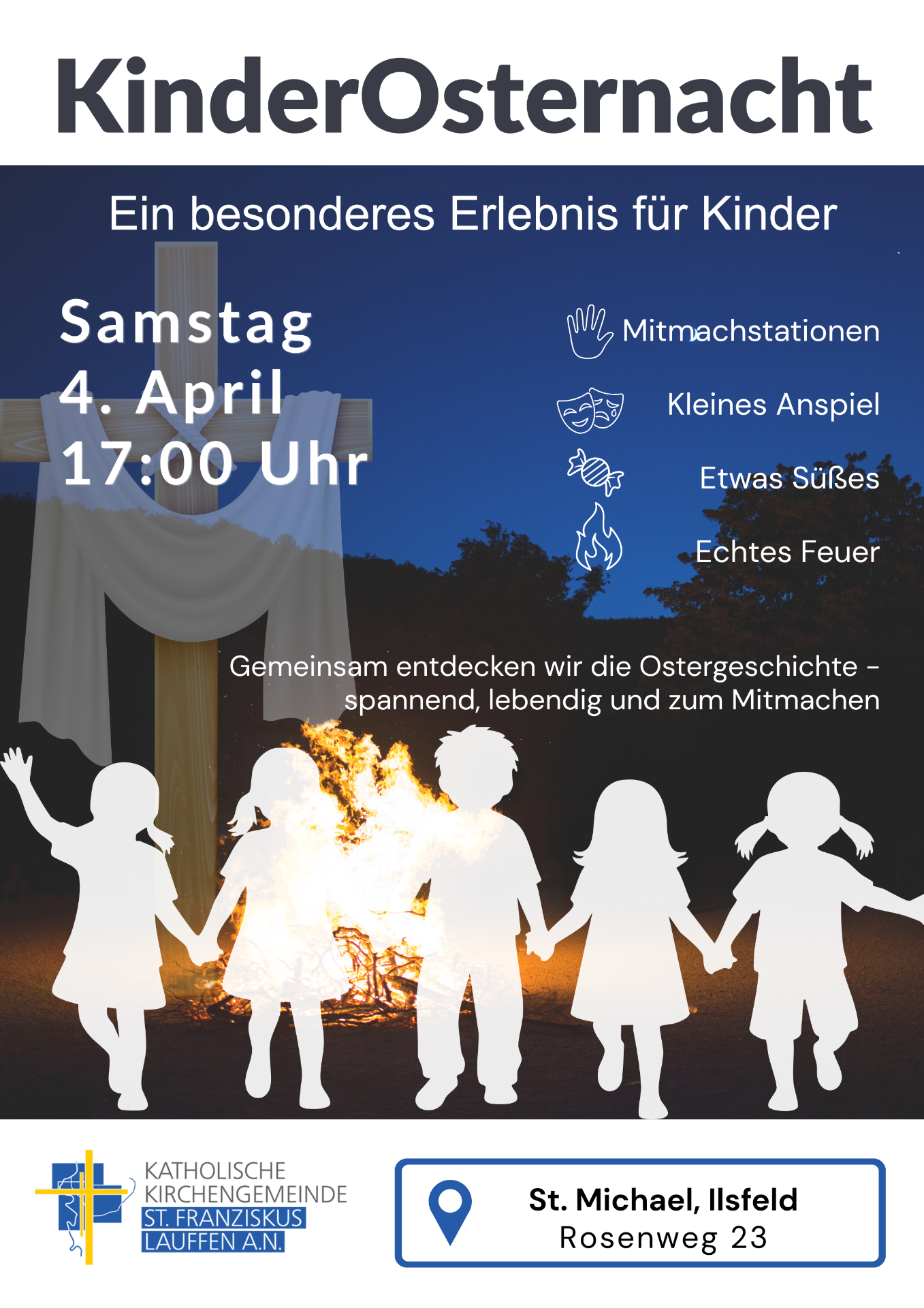 Am Samstag, den 4. April um 17:00 Uhr laden wir alle Kinder und Familien herzlich zur Kinder-Osternacht nach Ilsfeld ein.