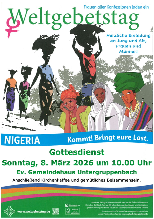 Am Freitag, den 6. März 2026, feiern wir mit Menschen in über 150 Ländern der Erde den Weltgebetstag der Frauen aus Nigeria. Herzliche Einladung zum ökumenischen Gottesdienst um 19:00 Uhr in der evangelischen St.-Veit-Kirche in Flein.